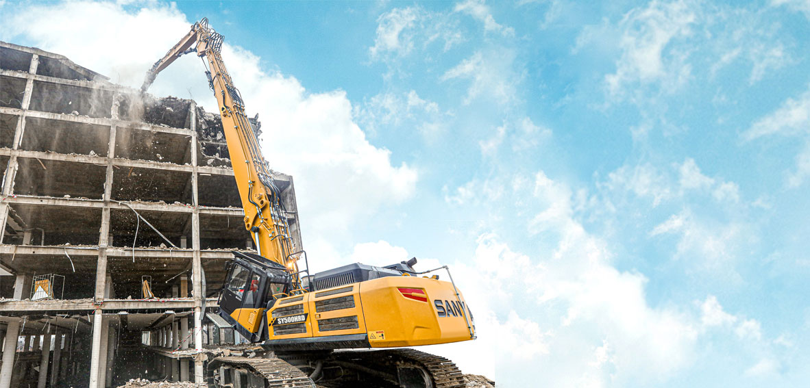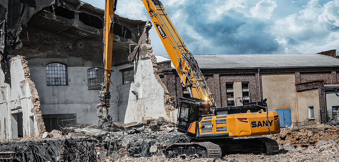 Grazie al suo braccio da 28 metri, SY500HRD consente lavori di demolizione precisi, anche su edifici e costruzioni alte.